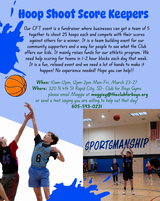 The Club for Boys is hosting its 32nd Annual Corporate Free Throw Event, where businesses in the community can compete by getting a team together to shoot hoops. The proceeds from the registration fees from each team go directly to our Athletic Program where our kids have access to age specific basketball and football leagues, daily recreation in the gym, and outdoor sports opportunities in the summer. You would be helping us keep score of the hoops made by each team. There are 2 hour timeslots, starting March 23-27th, so we would need help from 10am-12pm or 12pm-2pm each day.